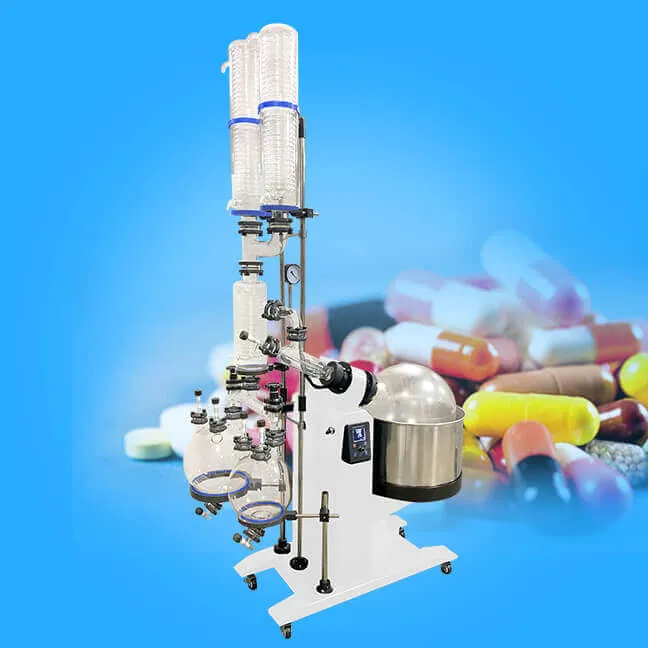 Rotačná odparka sa používa hlavne pre koncentrácie farmaceutických a chemických biofarmaceutických priemyslu, Kryštalizácia, sušenie, oddelení a rozpustení využitie uhlia. Princíp je: vákuové stavu, konštantná teplota Kúrenie otočiť fľaše konštantnú otáčania, materiál v bočnici vzniku veľkoplošné tenkovrstvových, vysoké odparovanie. Solubilizačné vysoké sklenené kondenzátor pára chladenie, oživenie fľašu zber výrazne zlepšiť účinnosť odparovanie, najmä jednoduché použitie vo vysoko-teplota rozkladu variability biologických produktov bola koncentrovaná a čistený.